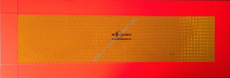 Eine rote Warntafel mit gelb-orangem, reflektierendem Mittelteil und Wabenstruktur.