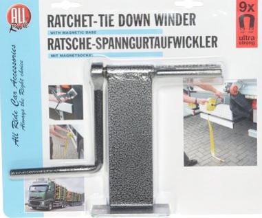 Ein metallener Ratschen-Spanngurtaufwickler mit Magnetsockel und silbernem Griff in Blisterverpackung.