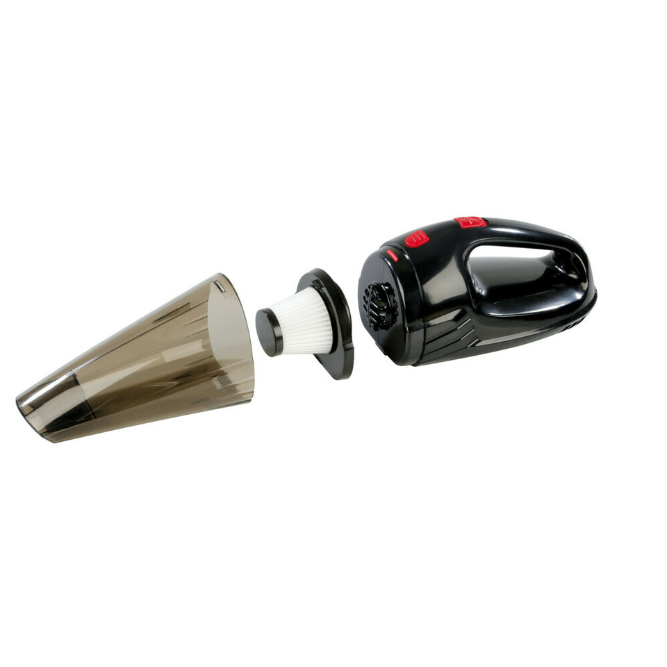 Schwarzer Handstaubsauger mit transparentem Staubbehälter, rotem Ein/Aus-Schalter und Zigarettenanzünder-Stecker.