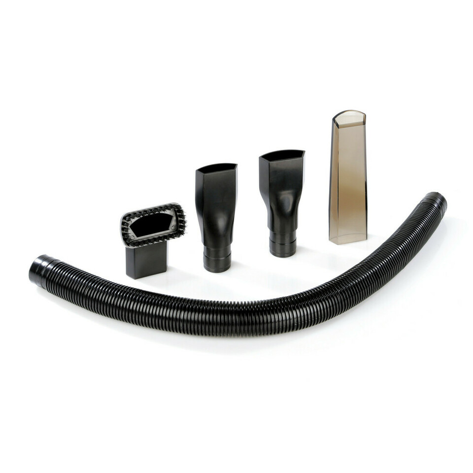 Schwarze Bürste, flexible Verlängerung, schmale und breite Düsen für den Handstaubsauger.