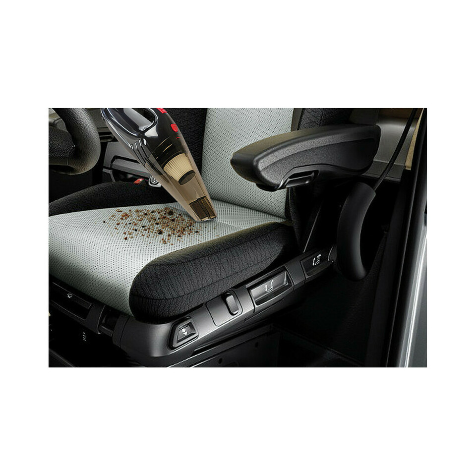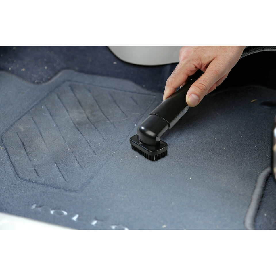Handstaubsauger mit Bürstenaufsatz reinigt den Teppichboden im Auto.