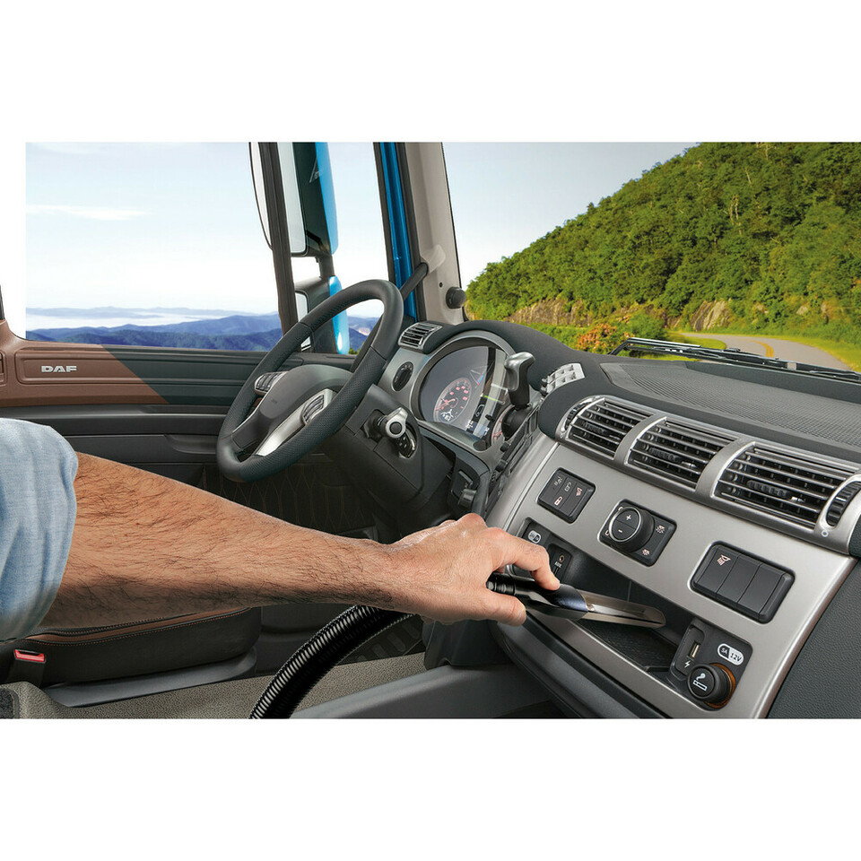 Schwarzer Handstaubsauger "Energy" mit flexibler Verlängerung reinigt das LKW-Fahrerhaus.