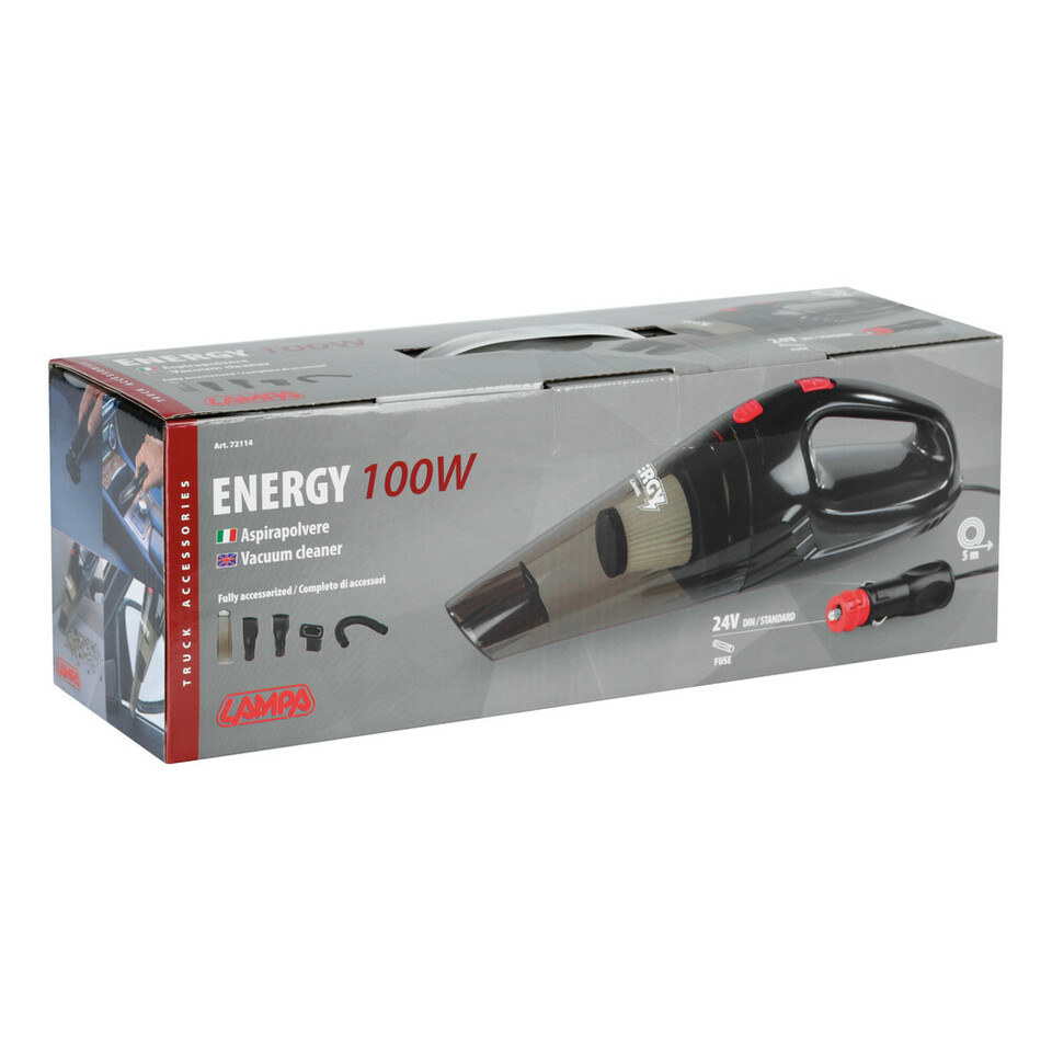 Verpackung des Handstaubsaugers 'Energy' 24V/100W. Zeigt schwarzen Sauger mit rotem Schalter, transparentem Behälter und Zubehör.