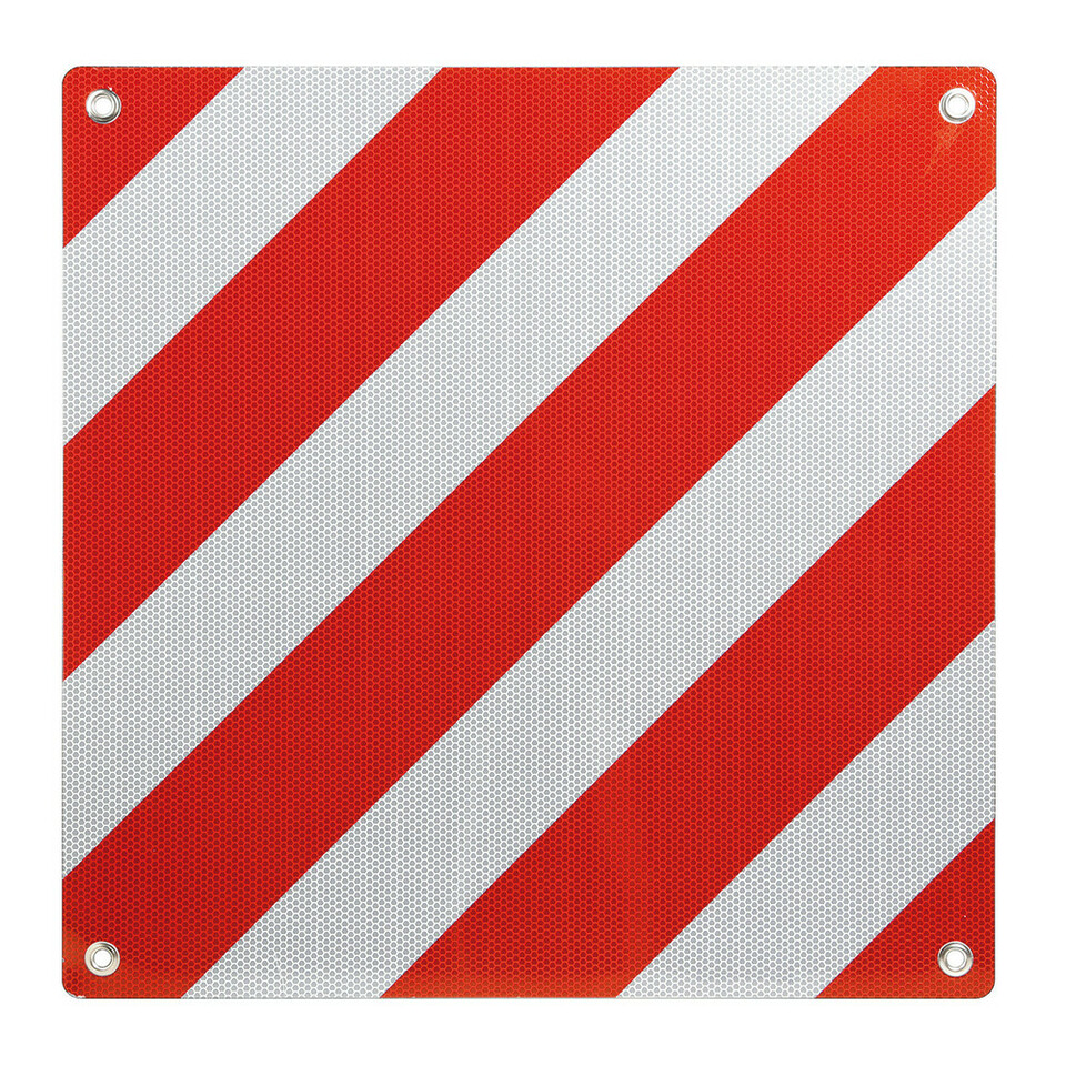 Reflektierende Warntafel für überstehende Ladung aus Aluminium mit roten und weißen Diagonalstreifen und Ösen.
