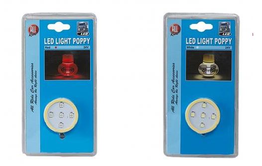Zwei Verpackungen für Poppy Lufterfrischer-Beleuchtung. Eine zeigt rotes, die andere weißes LED-Licht.