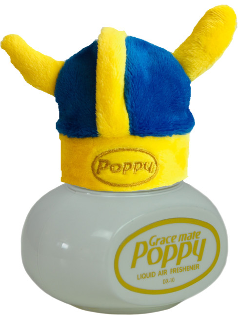 Blau-gelbe Plüsch-Wikinger-Mütze für Poppy Lufterfrischer, auf einem hellgrauen Flakon. Mit "Poppy" Schriftzug.