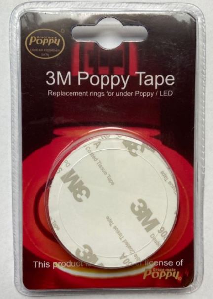 Verpackung mit 3M Poppy Tape Kleberingen. Runde, weiße Kleberinge für Poppy Lufterfrischer und LED-Beleuchtung.