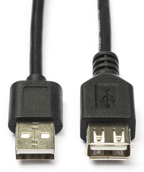 Schwarzes USB-Verlängerungskabel mit USB-A Stecker und Buchse, letztere mit USB-Logo.