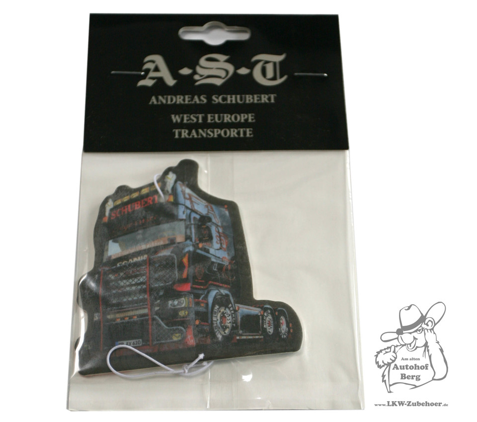 Einzeln verpackter Lufterfrischer AST in Form eines dunklen LKWs mit roter Akzentuierung. Schwarze Kopfkarte mit AST Logo.
