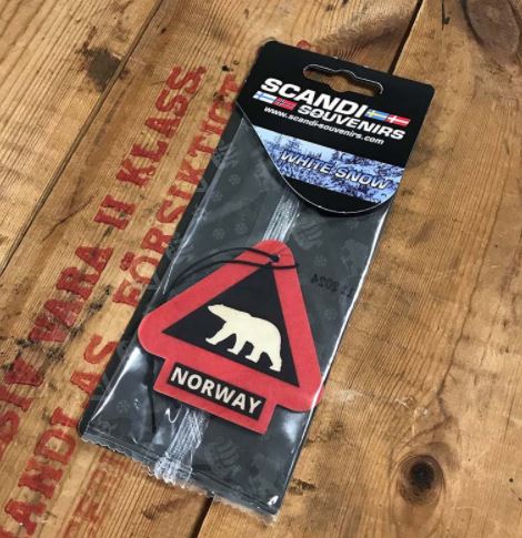 Verpackter Lufterfrischer als rotes Warndreieck mit weißem Eisbär und „NORWAY“. Duftrichtung „WHITE SNOW“.
