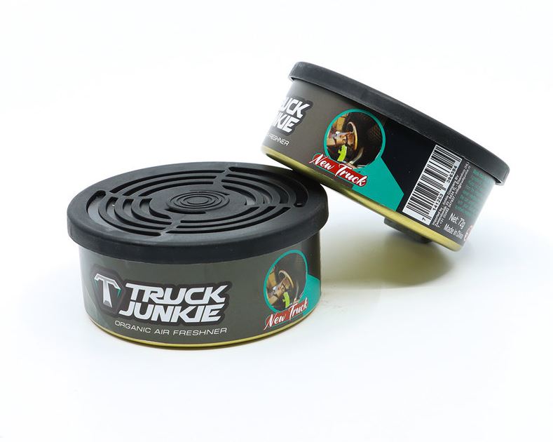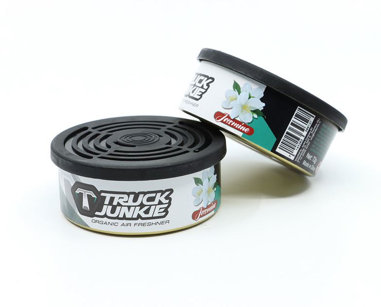 TJ Bio Lufterfrischer Dosen mit schwarzem, verstellbarem Deckel und Jasmin-Duft. "TRUCK JUNKIE" Logo.