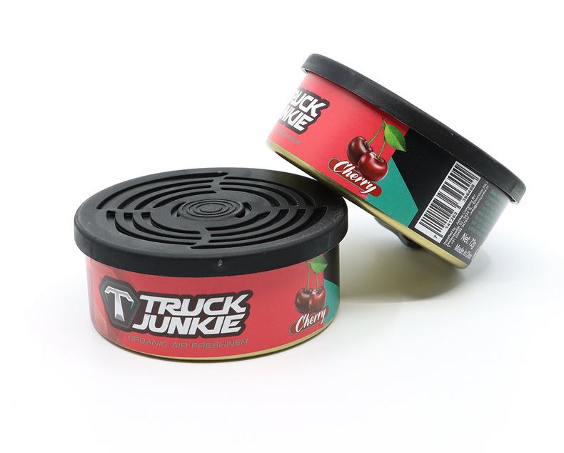 Rote Truck Junkie Lufterfrischer Dosen mit Kirschduft und schwarzer, verstellbarer Abdeckung.
