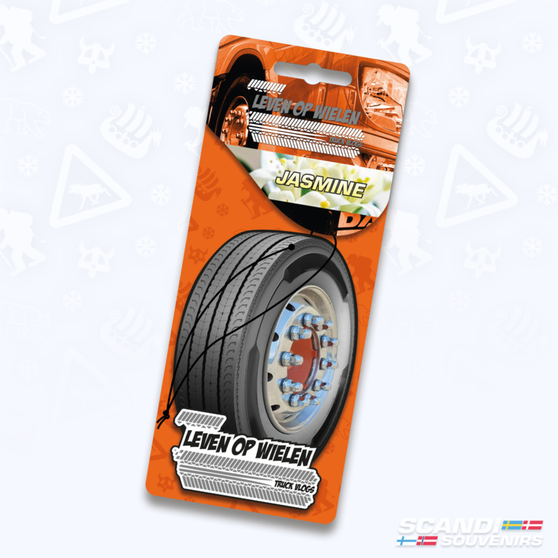 Oranger Lufterfrischer "Leven op wielen" mit LKW-Reifen und Chromfelge, Duft "Jasmine".