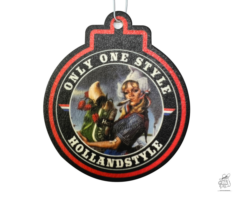 Lufterfrischer in Schwarz mit rotem Rand. Motiv: Frau in holländischer Tracht. Text: 'ONLY ONE STYLE HOLLANDSTYLE'.