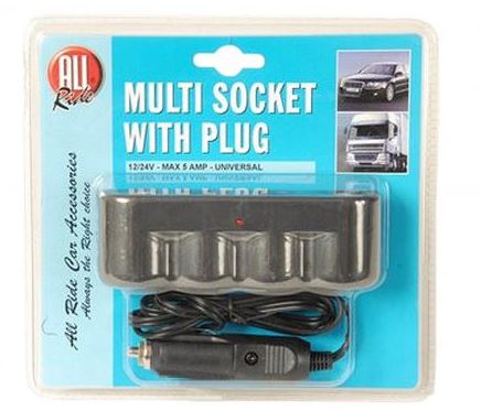 Schwarze 4er Steckdose mit Zigarettenanzünderstecker in Blisterverpackung.
