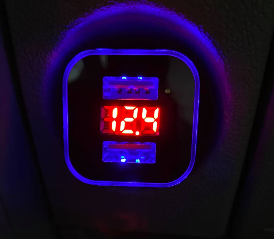 Blau beleuchtetes USB-Schnellladegerät mit roter Spannungsanzeige '12.4' und USB-Anschlüssen, im Fahrzeug montiert.