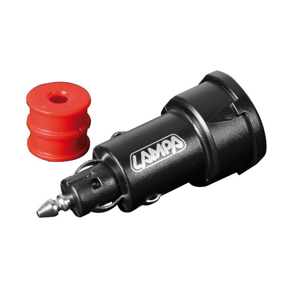 Schwarzer LKW-Ladestecker mit Metallspitze und rotem Gummiteil. Marke LAMPA.