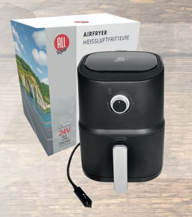 Schwarze ALLRide LKW-Heißluftfritteuse mit silbernem Griff und 24V-Stecker.