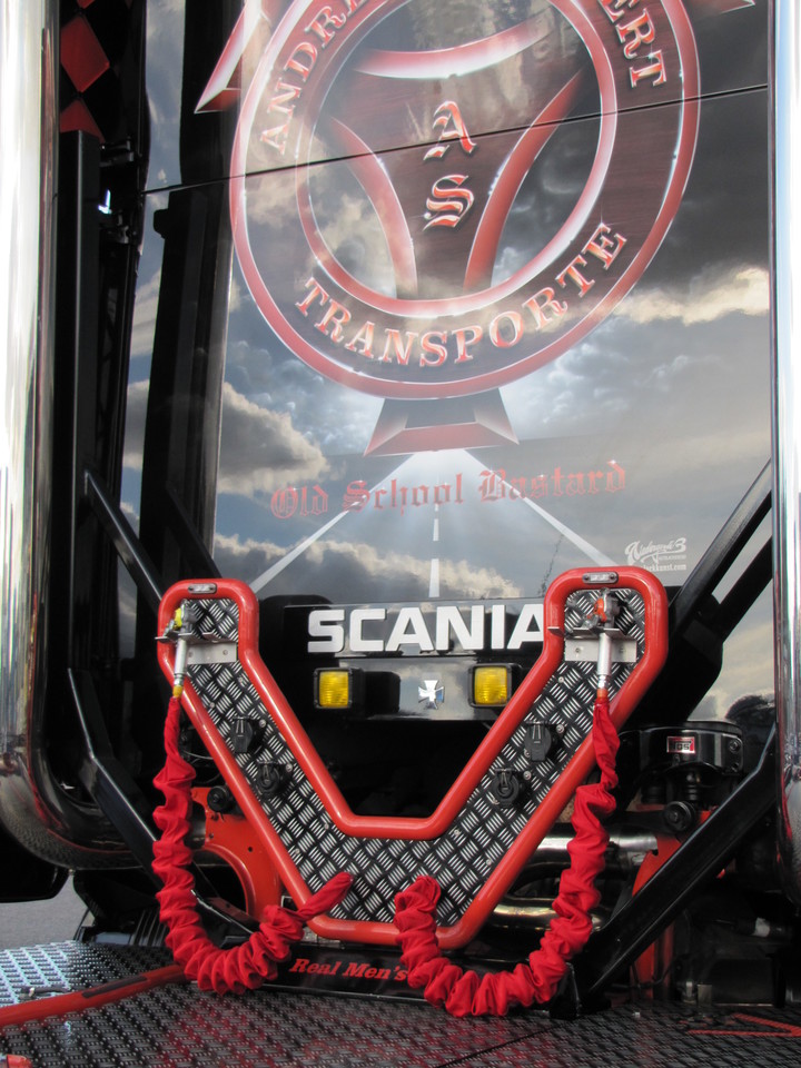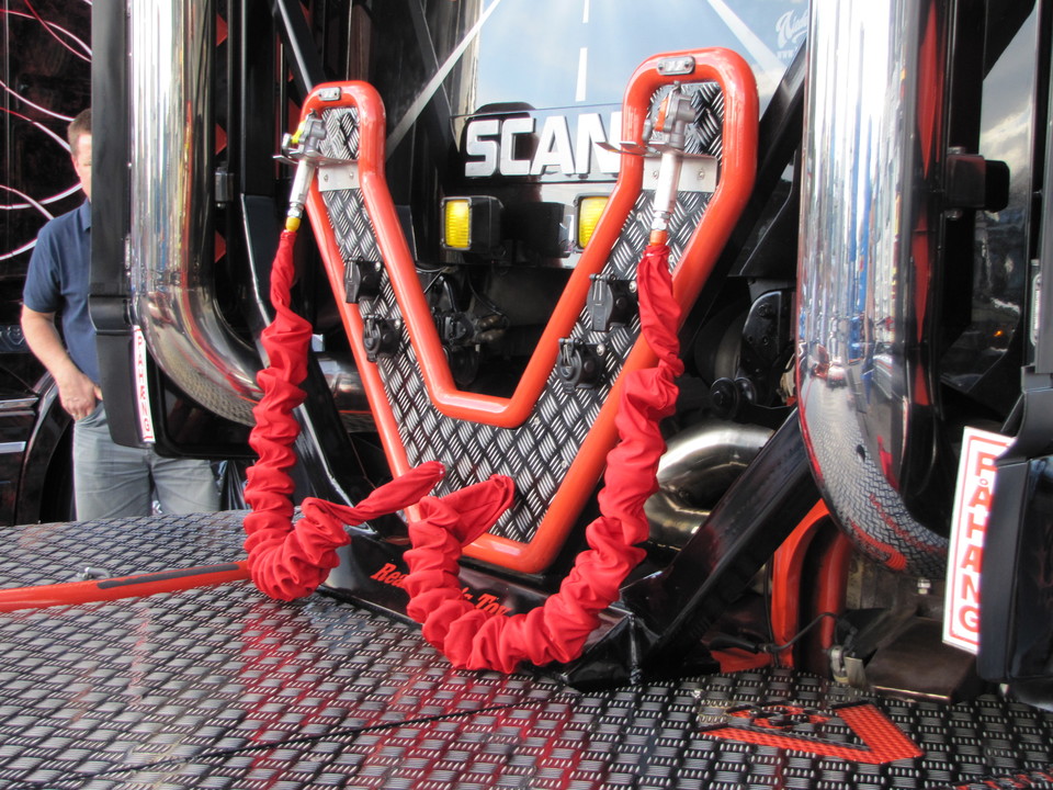 Rote, leicht glänzende Überzüge für Luftschläuche, montiert am Heck eines LKWs.