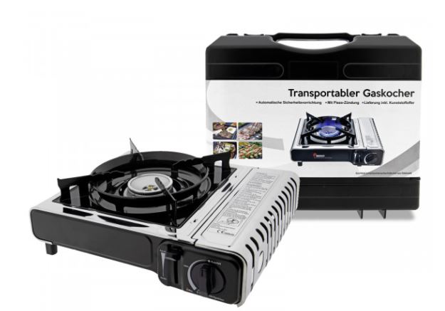 Tragbarer Gaskocher in Schwarz-Silber neben seinem schwarzen Transportkoffer mit der Aufschrift "Transportabler Gaskocher".