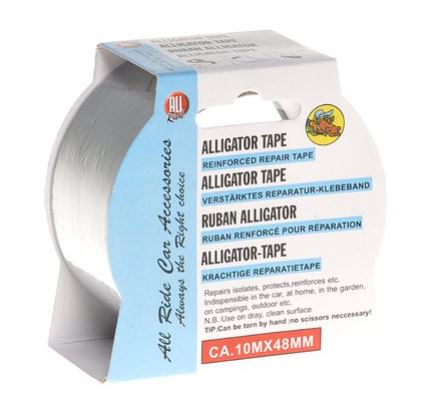 Eine Rolle graues Alligator Gewebeband in der Verpackung. Aufschrift: Alligator Tape, ca. 10m x 48mm.