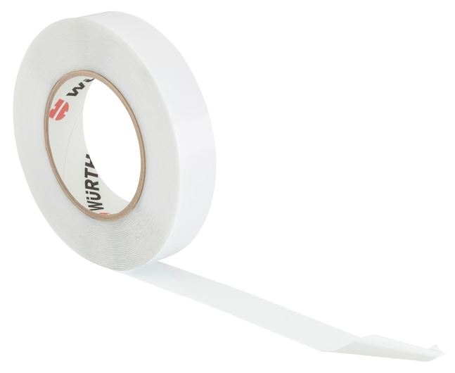 Eine Rolle weißes Würth Montageband Power, ein doppelseitiges Klebeband, mit abgerolltem Stück.