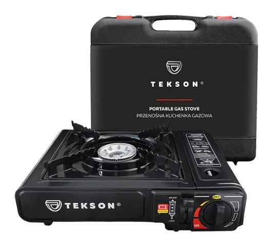 Schwarzer Tekson 2-in-1 Camping-Gaskocher aus Metall mit passendem Kunststoff-Transportkoffer.