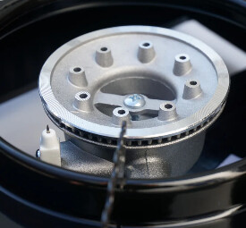 Detailansicht des silbernen Brenners eines Tekson Gaskochers mit Funkenzündung und schwarzem Topfgestell.