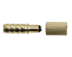 Messingfarbener Gasadapter mit geripptem Schlauchanschluss und gerändelter Kappe.