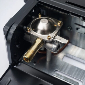 Nahaufnahme des Gasanschlusses am Tekson Gaskocher mit Sicherheitshebel, silbernen und messingfarbenen Metallteilen.