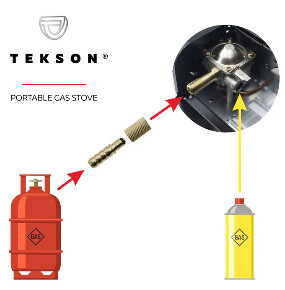 Diagramm: Tekson Gaskocher zeigt Anschluss an rote Gasflasche oder gelbe Gaskartusche.