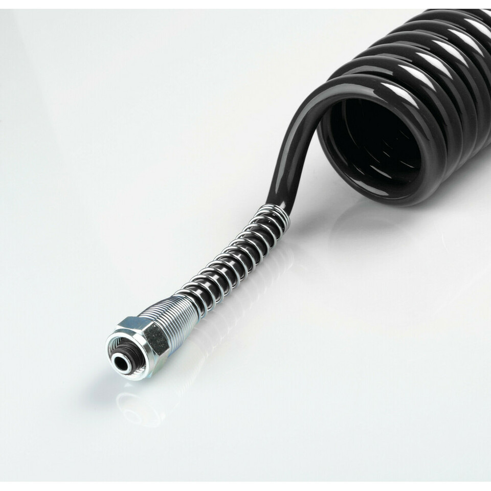 Schwarzer Luftspiralschlauch mit Metallanschlüssen und Federverstärkung an beiden Enden.