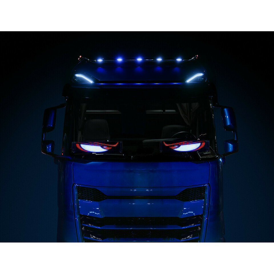 Frontansicht eines blauen LKWs mit leuchtenden Smart-LED Dekoschildern "Devil Eyes" an der Windschutzscheibe.