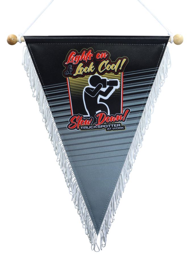 Schwarzer Wimpel mit grauen Streifen und weißen Fransen. Motiv: Truckspotter-Silhouette, Text „Slow Down!“ und „Lights on & Look Cool!“.