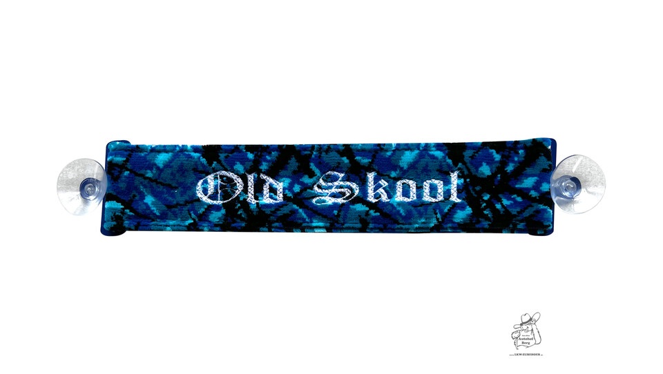 Ein blauer und schwarzer Plüsch-Minischal mit "Old Skool" Stickerei und Saugern an den Enden.