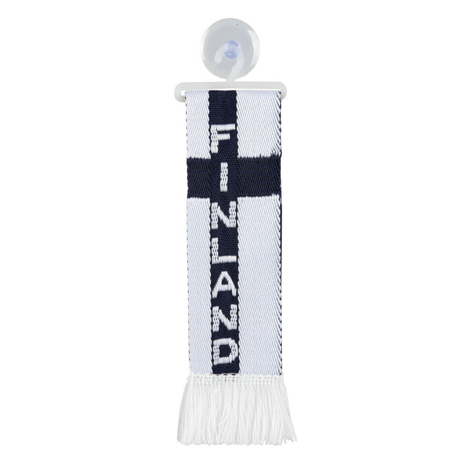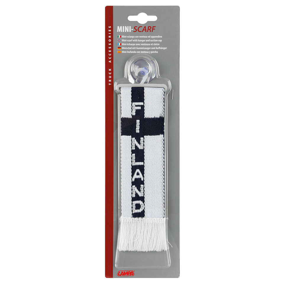 Minischal Finnland aus Textil, weiß mit blauem Kreuz und FINLAND-Aufschrift. Mit Sauger und Bügel für die Kabine.