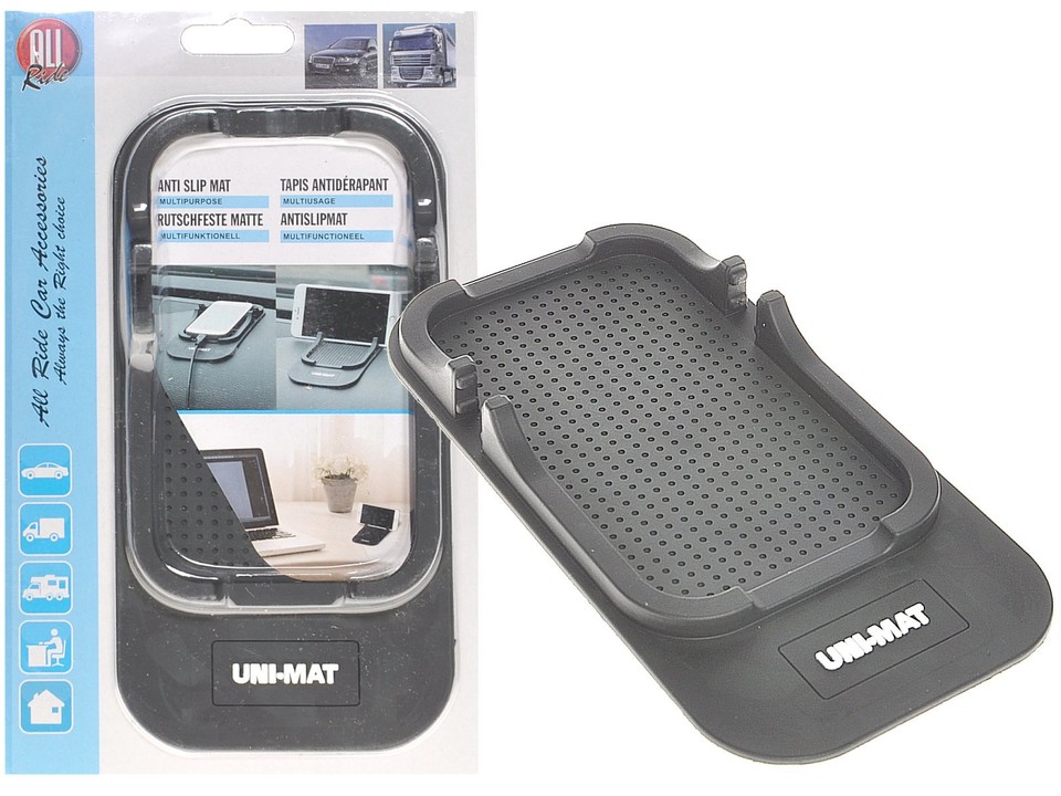 Schwarze Antirutschschale und Smartphone-Halter mit "UNI-MAT" Logo, teils in Verpackung.