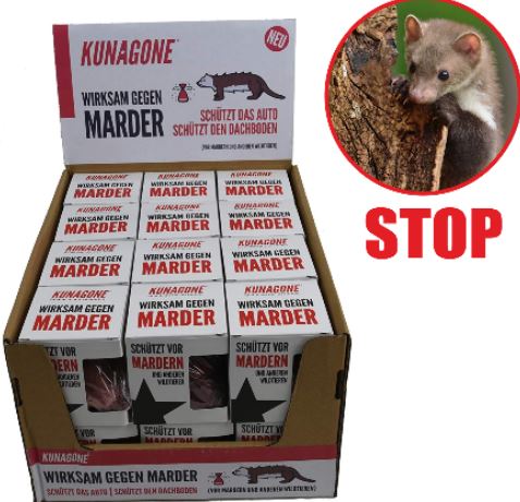 Brauner Karton-Display gefüllt mit weißen Kunagone Marderstopp-Packungen. Daneben ein Marder und roter STOP-Schriftzug.