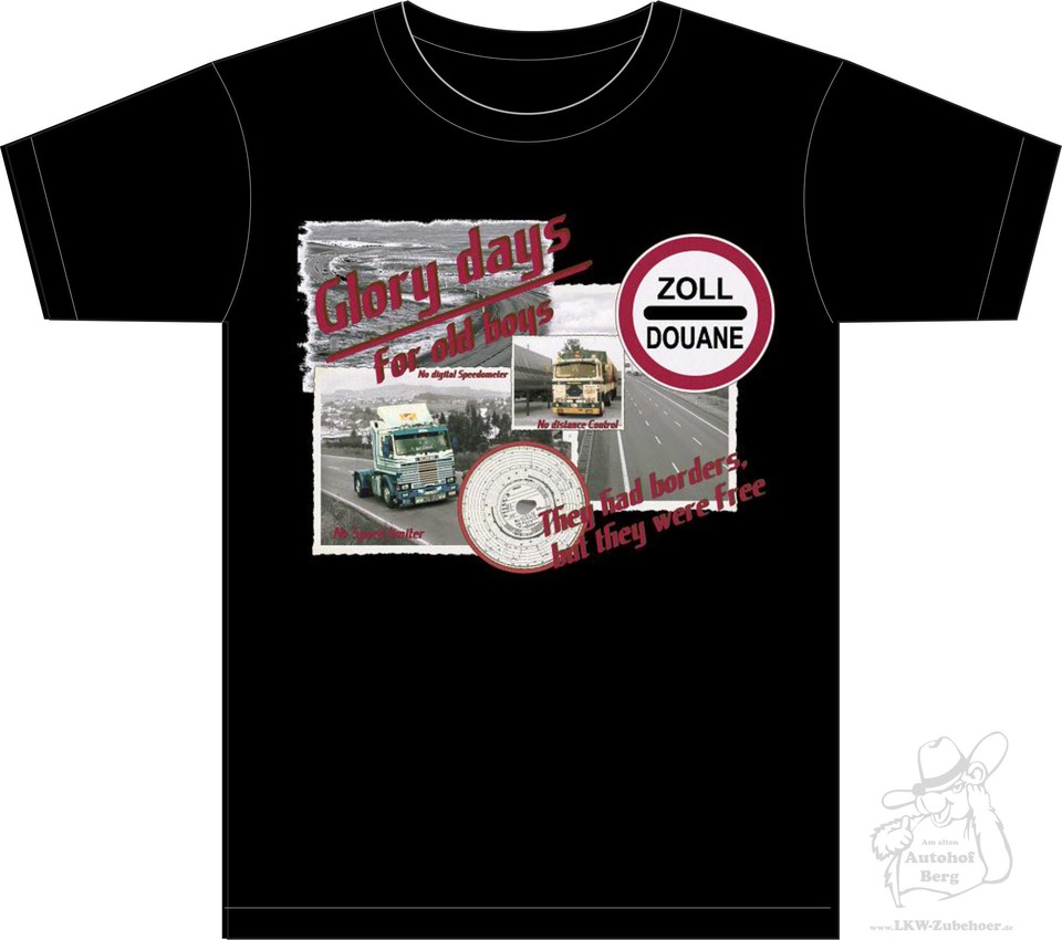 Schwarzes Baumwoll-T-Shirt mit Print von Oldtimer-LKW, Tachographscheibe und Zollschild. Aufschrift: Glory days For old boys.