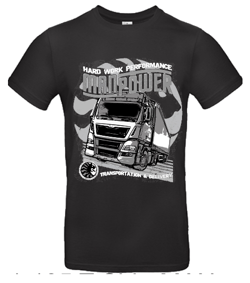 Schwarzes Baumwoll-T-Shirt mit großem, grauem LKW-Print und den Schriftzügen "MANPOWER" und "HARD WORK PERFORMANCE".