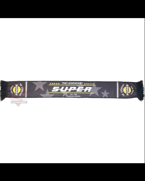 Schwarzer Trucker Schal mit gelben Sternen und dem Schriftzug 'SUPER'. Mit Fransen an den Enden.
