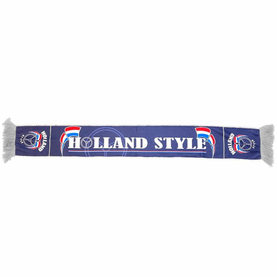 Dunkelblauer Trucker Schal aus Polyester mit 'HOLLAND STYLE' Schriftzug, Hollandflagge und Lenkrad-Symbol.