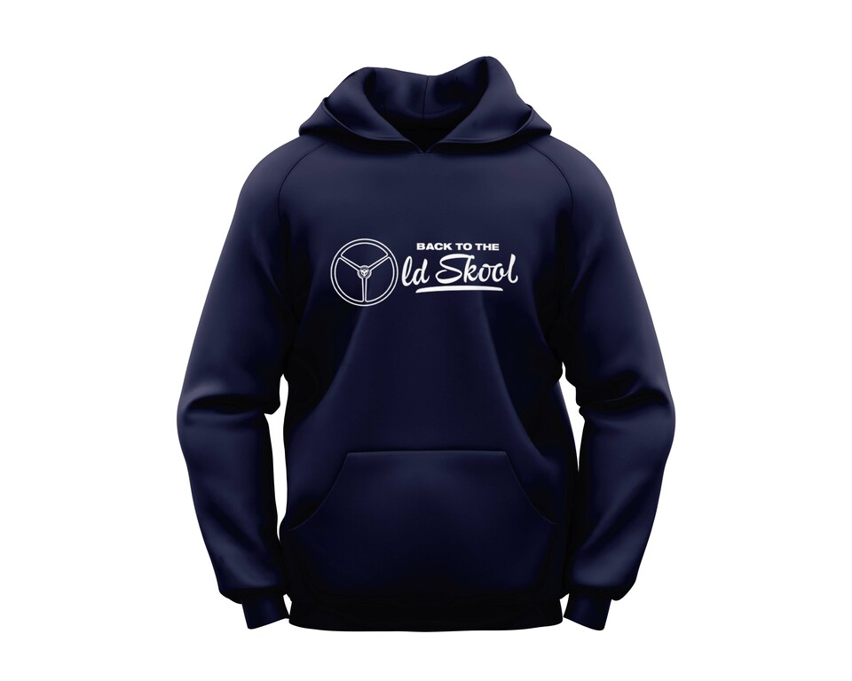 Dunkelblauer Scandi Hoodie mit weißem Lenkrad-Print und dem Text 'BACK TO THE Old Skool' auf der Brust.