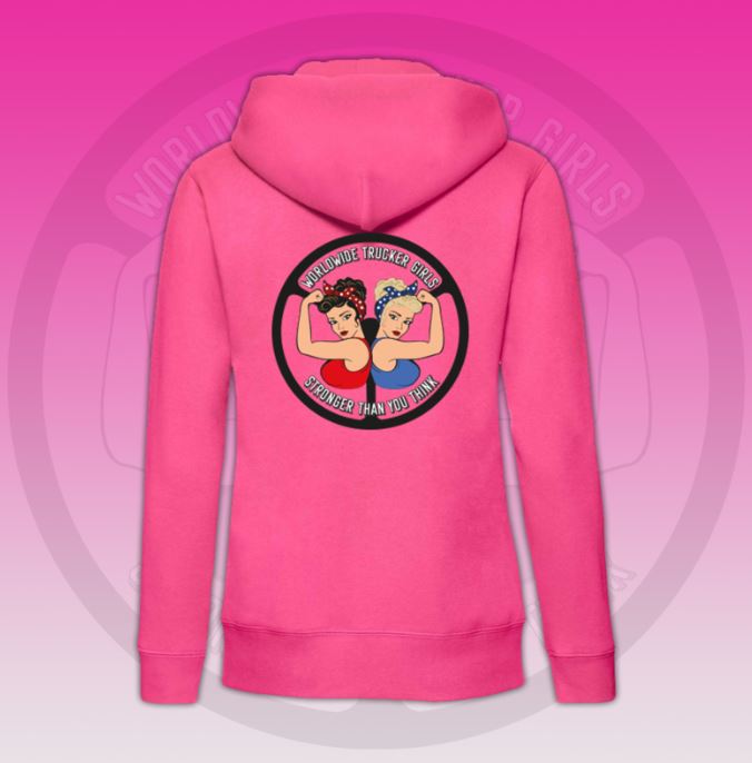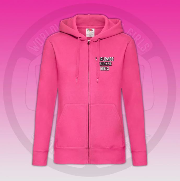 Pinker Damen Hoodie mit Reißverschluss und Kapuze. Auf der Brust ist der Schriftzug "WORLDWIDE TRUCKER GIRLS" zu sehen.