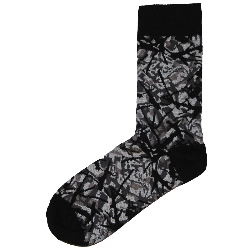 Graue Plüsch Style Socke mit abstraktem Muster in Schwarz und Hellgrau auf weißem Hintergrund.