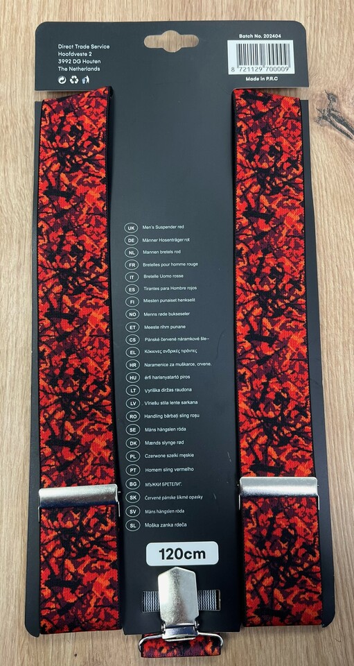 Hosenträger mit auffälligem rot-schwarzem Muster, schwarzen Lederdetails und silbernen Metallclips auf Verpackung.