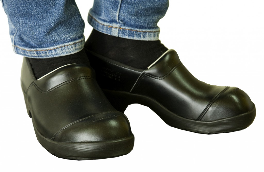 Ein Paar schwarze, geschlossene EURO-DAN Sicherheitsclogs aus Leder, getragen mit blauen Jeans.