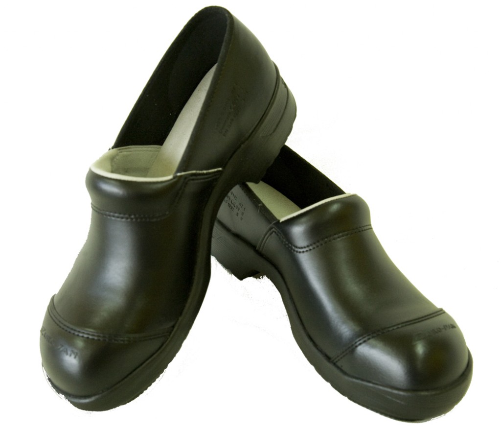Ein Paar schwarze EURO-DAN Sicherheitsclogs aus Leder mit geschlossener Zehenkappe.