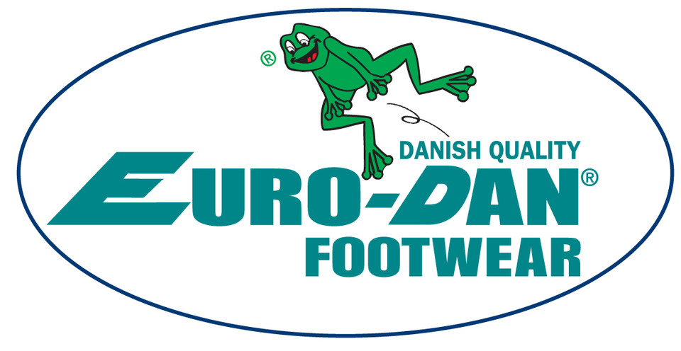 Logo für EURO-DAN FOOTWEAR, zeigt einen springenden grünen Frosch und den Text 'DANISH QUALITY'.