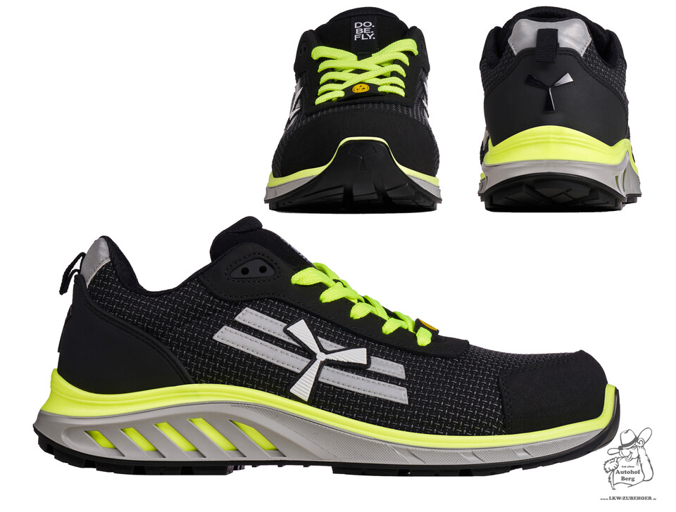 Drei Ansichten des schwarz/gelben Sicherheitsschuhs X-MARS mit weißem Logo und strukturierter Oberfläche.